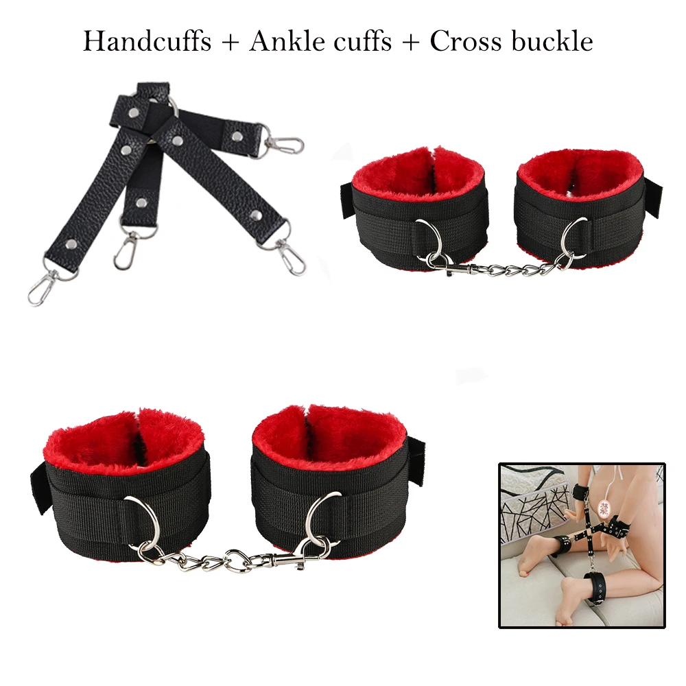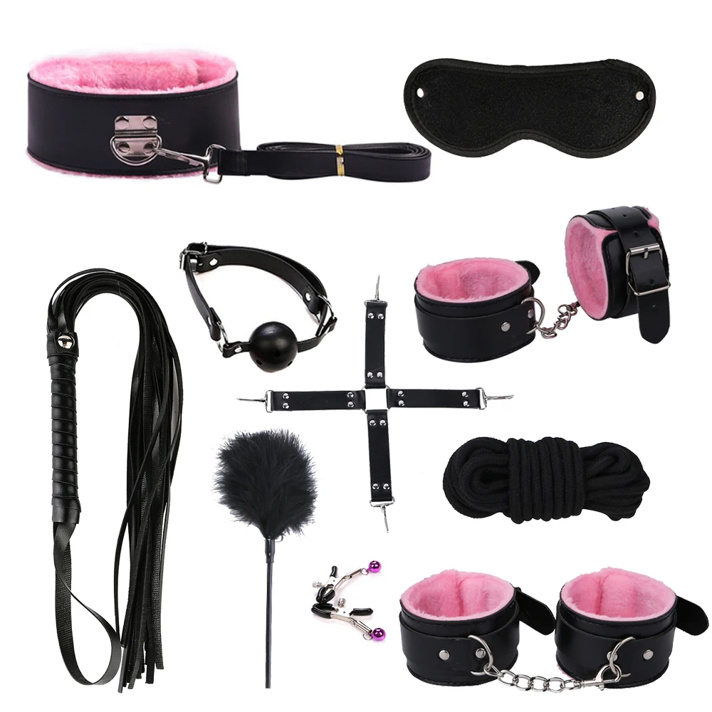 Наручники * 1 пара + манжеты на лодыжке * 1 пара + кнут + воротничок + зажим для сосков + маска для глаз + кляп для рта