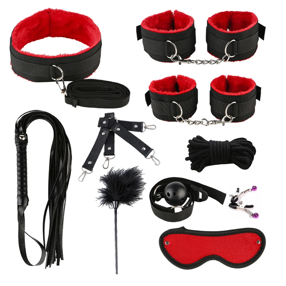 Наручники * 1 пара + манжеты на лодыжке * 1 пара + хлыст + воротничок + зажим для сосков + маска для глаз + кляп для рта + веревка 5 м + перекрестная пряжка + флирт с перьями