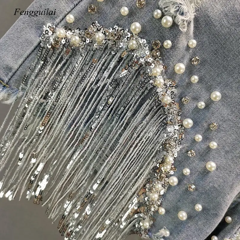 Шорты женские джинсовые с высокой талией, рваные штаны с бахромой и блестками, приталенные, с тяжелыми бусинами и широкими штанинами, летняя одежда