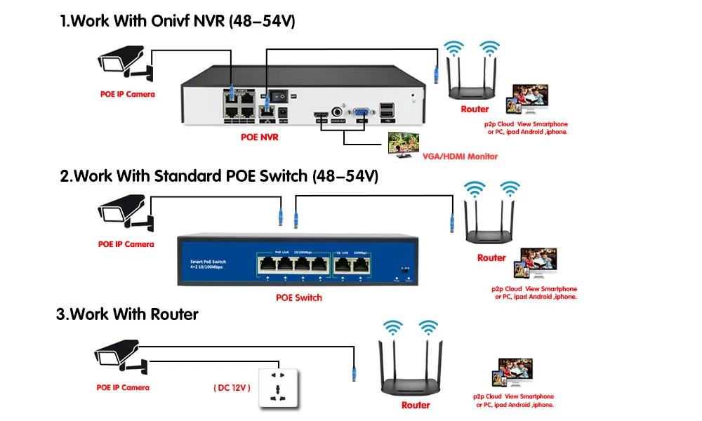 Простая настройка, всего 4 шага для просмотра на мобильный телефон,Просмотр видео в режиме реального времени в системе из любого места и в любое время с помощью смартфона, стола или ПК с передовой технологией P2P, вы можете получить удаленный доступ к вашей системе в течение нескольких минут или меньше, нет необходимости в переадресации, удаленный доступ никогда не был таким простым!