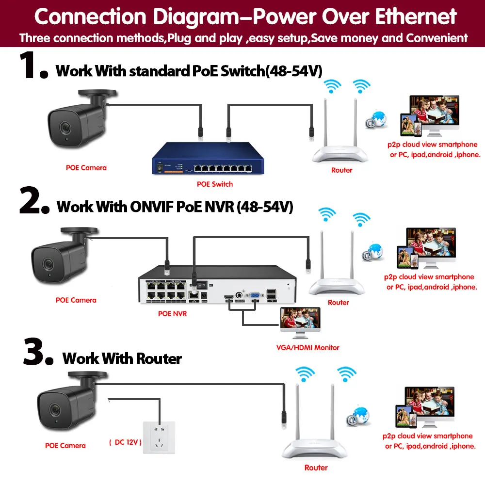Нет дополнительных кабелей питания или адаптеров, просто подключив ip-камеру к NVR с помощью одного кабеля, вы можете легко завершить установку без знания о компьютере или сети и начать наслаждаться супер простым мониторингом среди вашего смартфона, планшета или ПК.