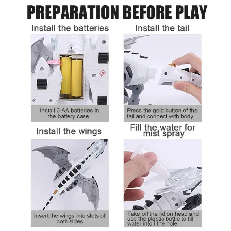 4. Легко установить и играть: нужно только положить 3 батарейки АА в чехол батареи и установить крылья и хвост вручную, налейте воду в голову, затем включите кнопку питания.
