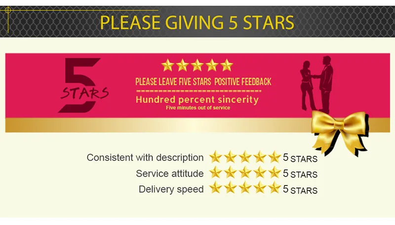 1. Если вы удовлетворены нашими продуктами и услугами, пожалуйста, оставьте положительный отзывы и 5 звезд. Мы предоставим Вам скидку для следующего заказа.2. Если вы поделитесь ссылкой на наш продукт на SNS, мы предоставим вам подарок или скидку для следующего заказа.3. Если вы не удовлетворены нашей продукцией, пожалуйста, свяжитесь с нами, прежде чем оставить нейтральный (3 звезды) или отрицательный (1-2 звезды) отзывы. Мы гарантируем 100% решение любой проблемы для вас.4. Пожалуйста, отправьте нам сообщение, прежде чем оставить отрицательный отзывы или открыть спор на сайте. Общение-лучший способ решить проблемы.