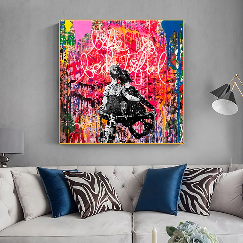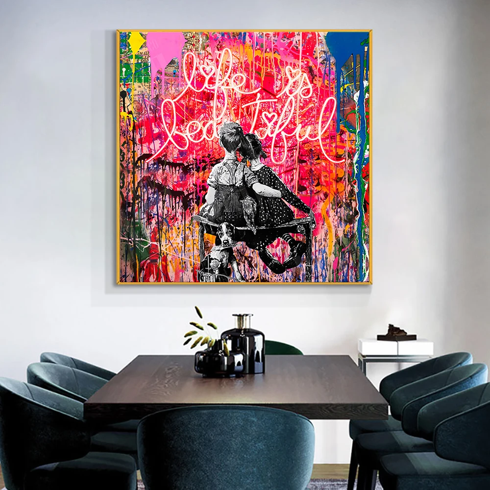 Граффити Бэнкси, поп-арт, жизнь, красивый плакат и печать, мальчик, девочка и собака, Картина на холсте, картина для творчества, декор для домашней комнаты