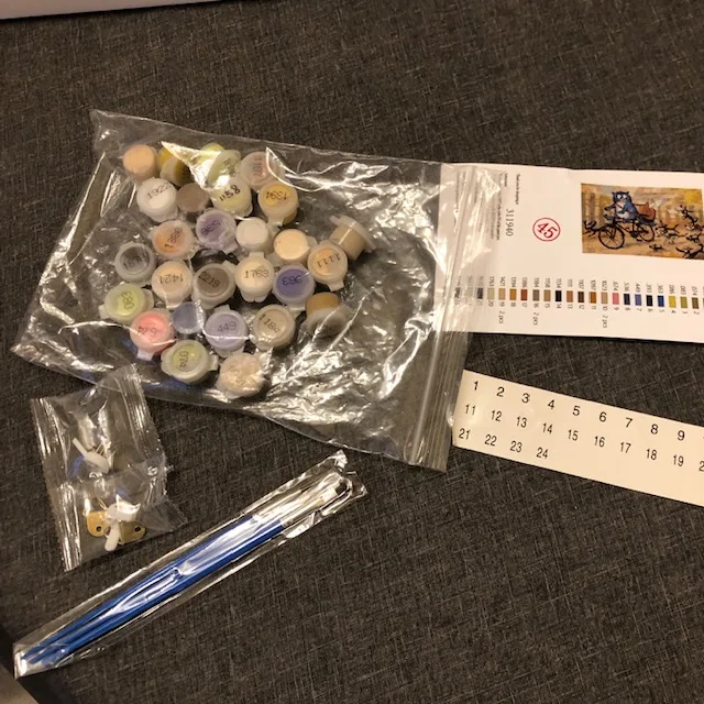 Посылка пришла очень быстро, абсолютно никаких претензий по этому поводу. Посылка содержит все как в описании-полотно на раме, краски, кисти и крючками. Тем не менее, есть некоторые проблемы, которые делают опыт не очень приятно. Во-первых, комбинация цветов рисунок не всегда соответствует картинке один делает. Например, кот должен быть синего цвета, на самом деле он окажется фиолетового цвета. Также много мелких деталей на картинке не содержат (S, M, L, есть просто мало места), поэтому необходимо использовать свою фантазию с тех пор, как нет отдельного A4 бумага с цифрами, так как это часто С другими поставщиками. И самая большая проблема заключается в том, что многие виды краски полусухие, поэтому очень трудно используйте их-мне придется использовать даже немного воды, чтобы сделать их мягче! И три краски полного высыхания-как сухой как камень, поэтому я не могу использовать их вообще! Я сделал живописи по номерам ранее так что я просто использовать некоторые больше или меньше соответствующих цветах от старого комплекты я случайно, чтобы иметь.