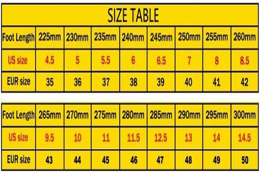 1. Подходящий размер в таблице размеров-это максимальный размер,Пожалуйста, допускайте ошибку5-5 мм. Перед оформлением заказа внимательно сравните таблицу размеров с длиной стопы.2. Пожалуйста, выберите наиболее подходящий размер в соответствии с нашей таблицей размеров! Это оченьВажно, спасибо за понимание и сотрудничество!3. Если вы не знаетеКак выбрать правильный размерИли у вас есть какие-либо вопросы об этомПродукт, пожалуйстаСвяжитесь с намиМы дадим вам удовлетворительные ответы как можно скорее.