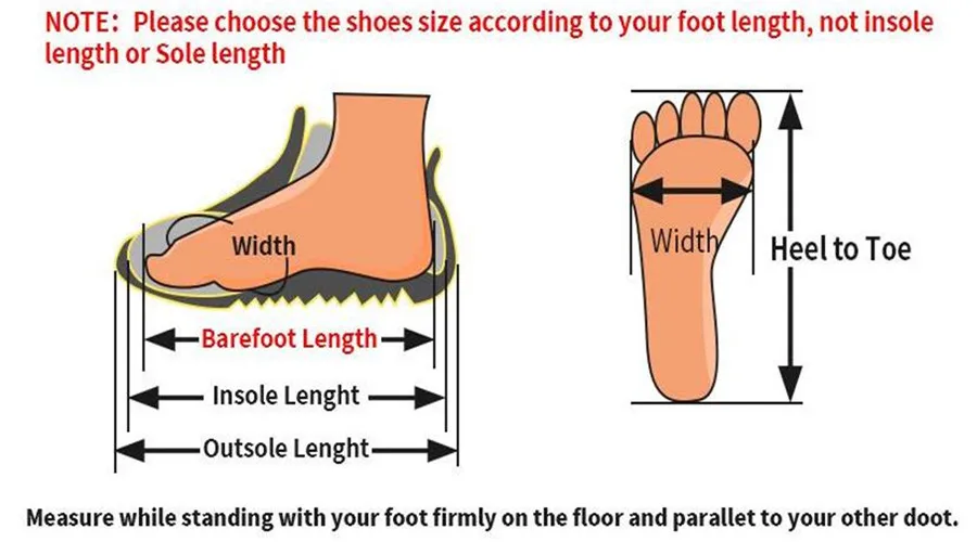 Важно!Как выбрать правильный размер?1. Измерьте вашДлина стопыКак на фото.2. Найдите ''Размер'' в таблице размеров Вашей стопы!3. Не измеряйте длину стельки, она отличается от длины стопы.4. Для точного размера, пожалуйстаНе надоПокупайте напрямую в соответствии с европейскими размерамиСтраны. Это должно быть в соответствии сДлина стопы.Способ измерения