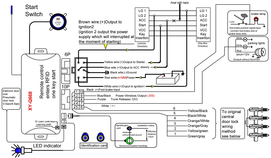 Этот продукт является полной системой пуска одной кнопки с беспроводным пультом дистанционного управления в транспортное средство и rfid-противоугонным устройством. Основная функция заключается в удаленном разблокировании транспортного средства, удалении противоугонного устройства с помощью карты датчика RFID и запуске и остановке транспортного средства с помощью одной кнопки запуска. После остановки транспортного средства он автоматически попадет в состояние защиты от кражи RFID через 90 секунд. Когда беспроводной пульт дистанционного управления запирается, окна закроются автоматически. В то же время, есть звуковой сигнал и функция напоминания на светильник, и багажник может быть открыт удаленно.