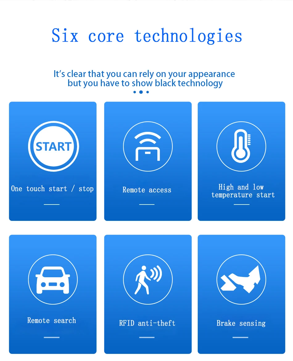 Этот продукт является полной системой пуска одной кнопки с беспроводным пультом дистанционного управления в транспортное средство и rfid-противоугонным устройством. Основная функция заключается в удаленном разблокировании транспортного средства, удалении противоугонного устройства с помощью карты датчика RFID и запуске и остановке транспортного средства с помощью одной кнопки запуска. После остановки транспортного средства он автоматически попадет в состояние защиты от кражи RFID через 90 секунд. Когда беспроводной пульт дистанционного управления запирается, окна закроются автоматически. В то же время, есть звуковой сигнал и функция напоминания на светильник, и багажник может быть открыт удаленно.