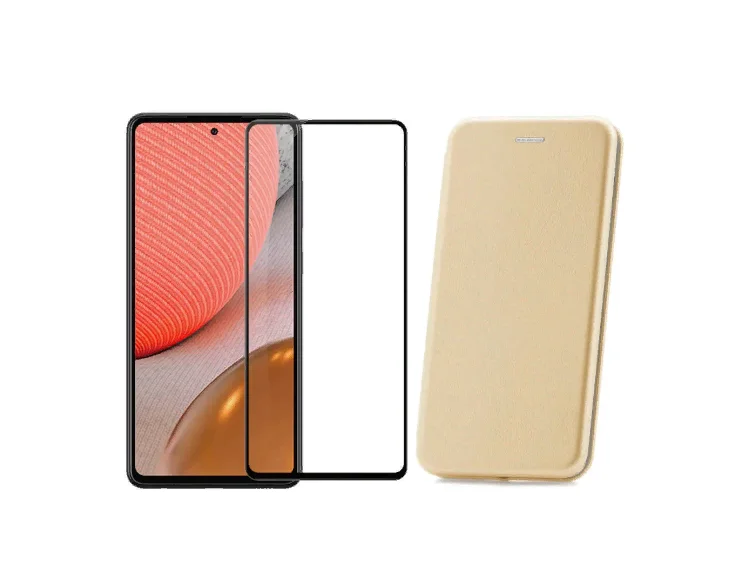 Выгодный комплект 2 в 1 для Xiaomi redmi 9A: чехол книжка иск. кожа золотой+ защитное полноэкранное черное стекло