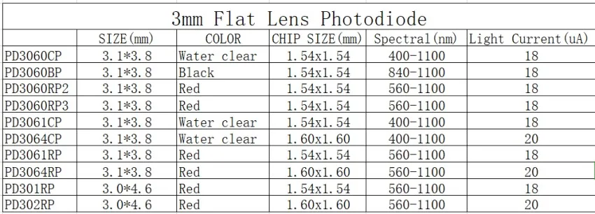 PD204-6C:Размер чипа: 1,54 мм x 1,54 мм, обратный Фоточувствительный ток 60 мкА