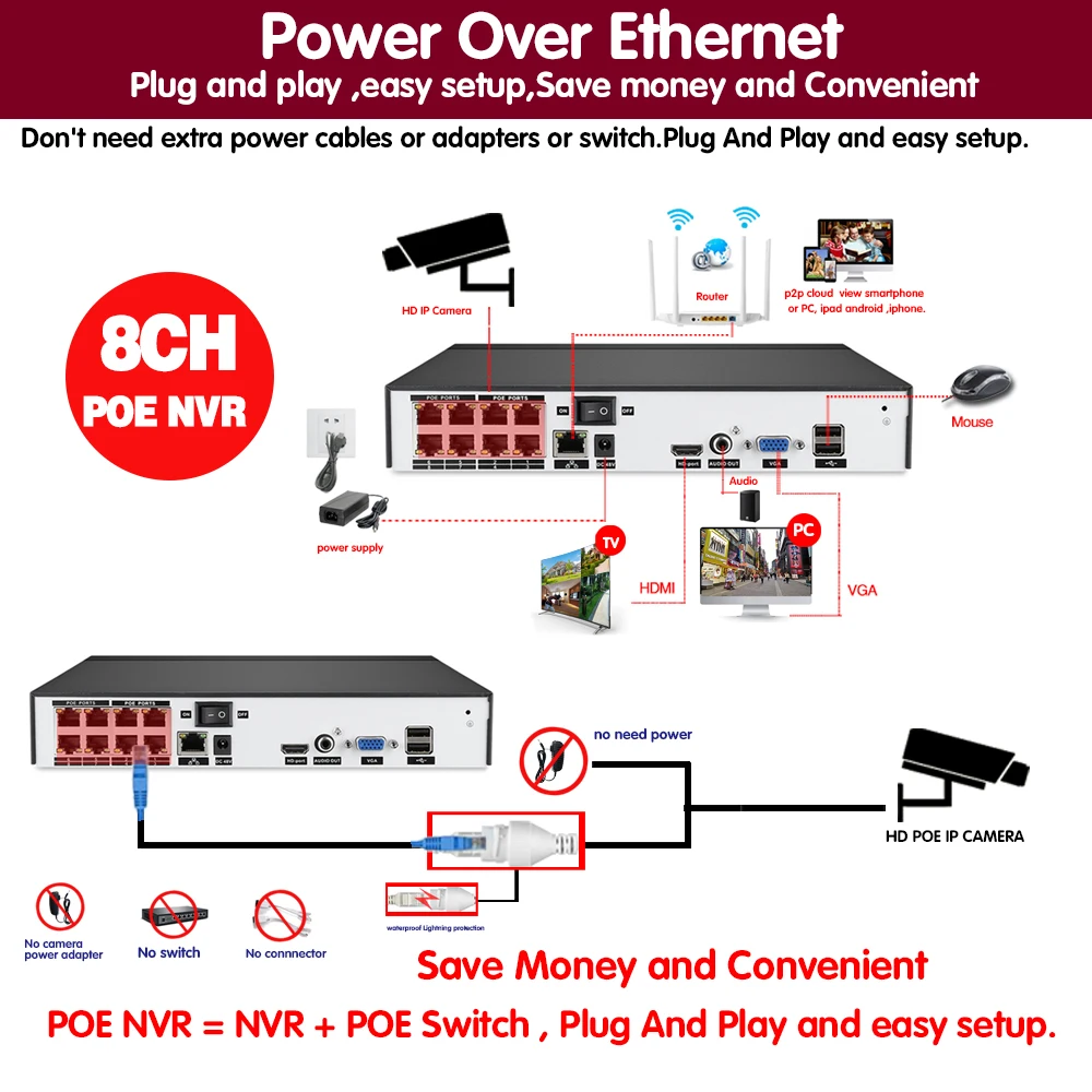 Нет дополнительных кабелей питания или адаптеров, просто подключив ip-камеру к NVR с помощью одного кабеля, вы можете легко завершить установку без знания о компьютере или сети и начать наслаждаться супер простым мониторингом среди вашего смартфона, планшета или ПК.