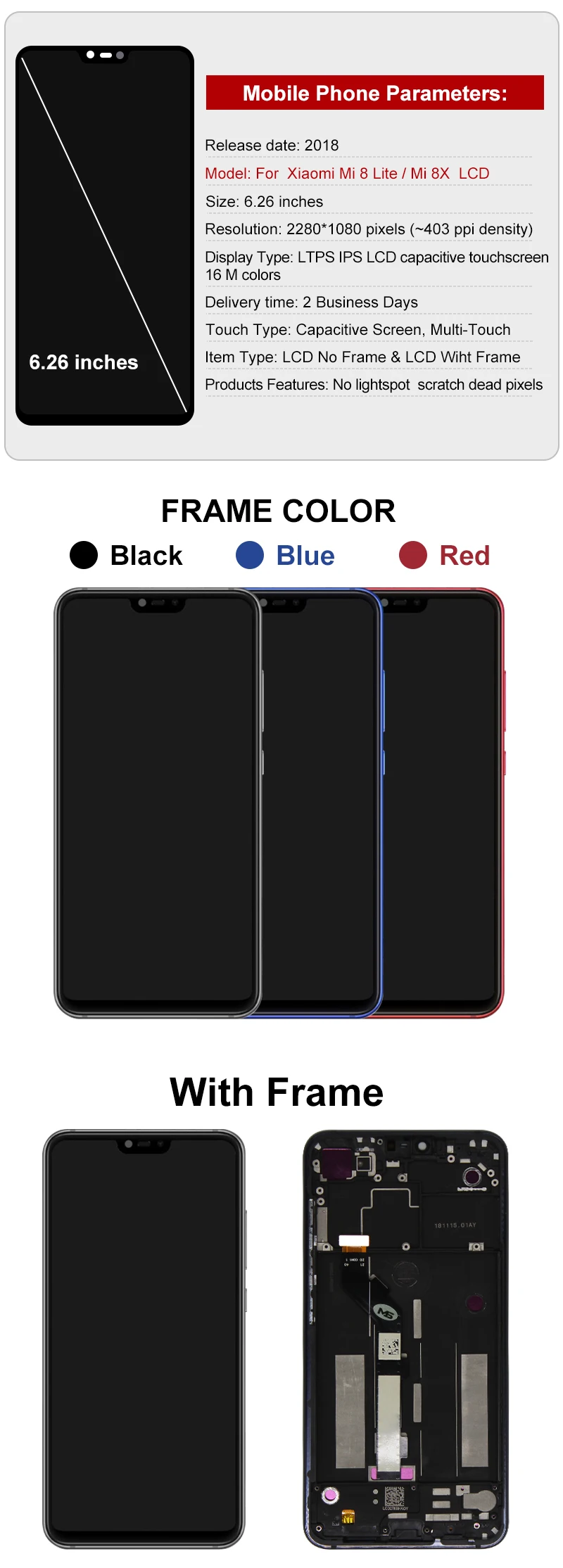 ЖК-дисплей 6,26 дюйма для Xiaomi Mi 8 Lite, Mi 8X, 8 Youth, сенсорный дигитайзер, запасные части для Mi 8 Lite, дисплей с рамкой