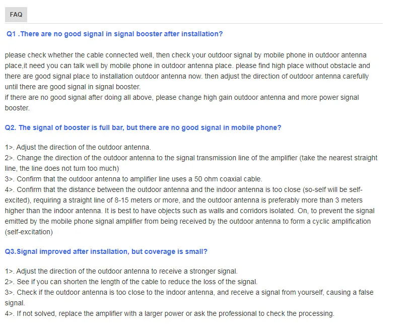Затем проверьте ваш наружный сигнал с помощью мобильного телефона на вашем месте снова, если ваш наружный сигнал очень плохой, усилитель не может хорошо работать на вашем месте. Вы также можете вернуть товар на наш склад для возврата денег.