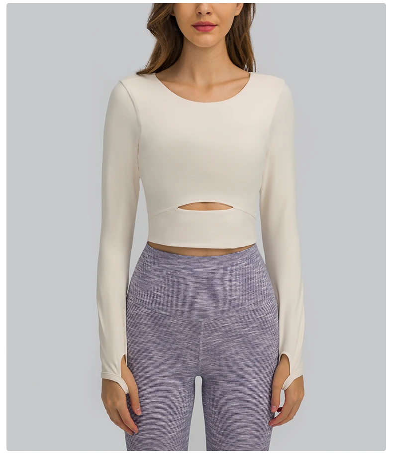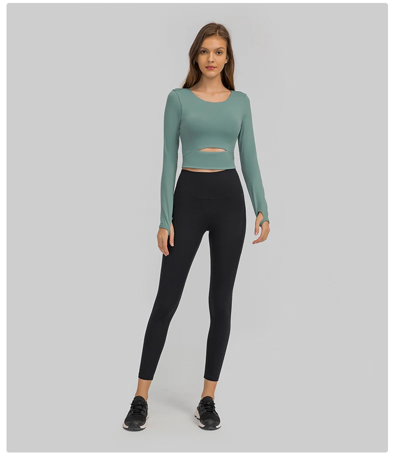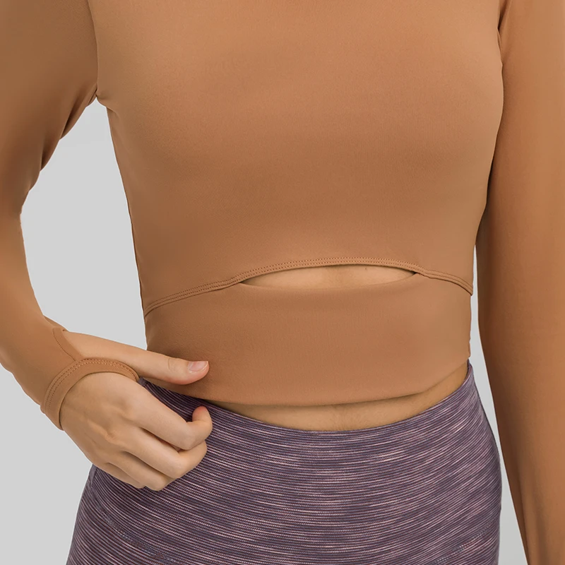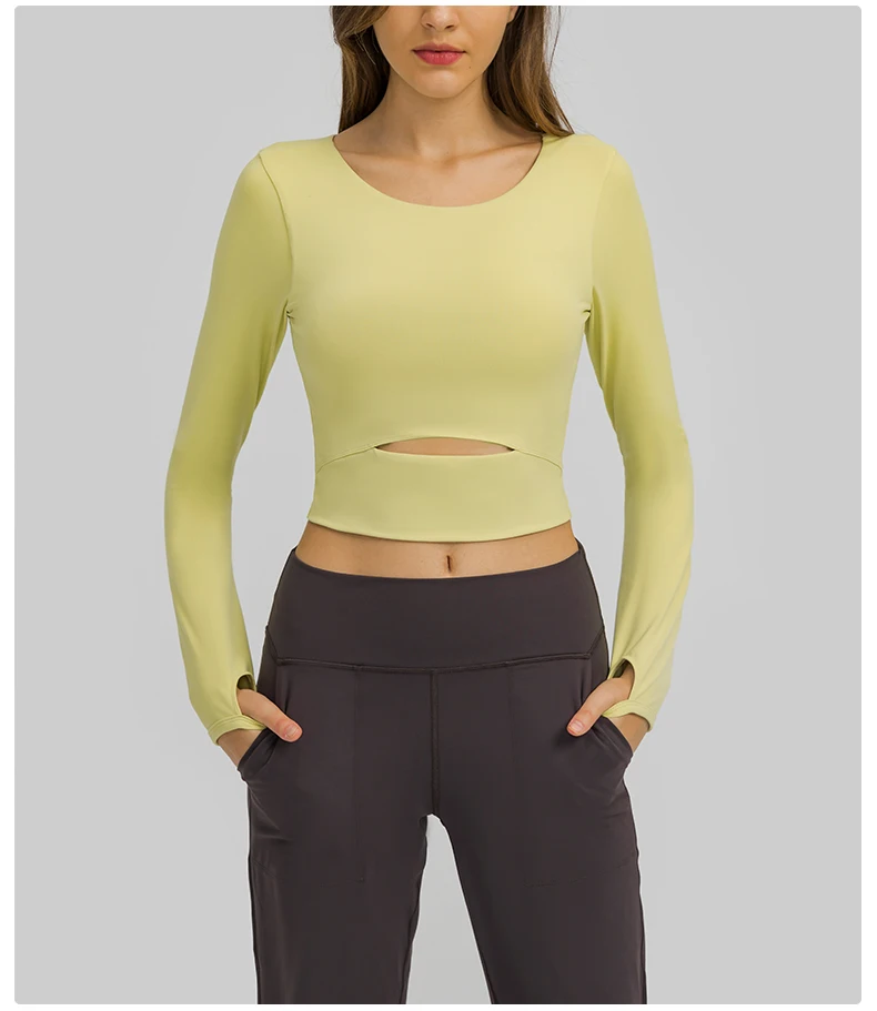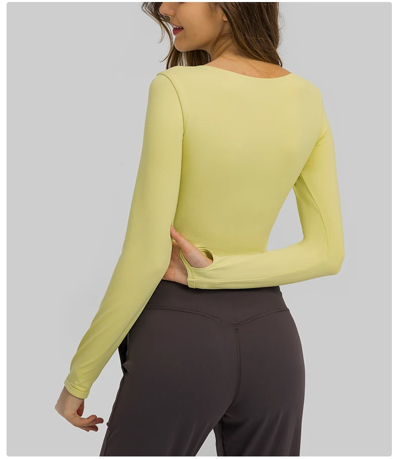 Футболка женская с длинным рукавом и глубоким вырезом, нейлоновый укороченный топ для занятий йогой, фитнесом, пуловер для воркаута с дырками для большого пальца