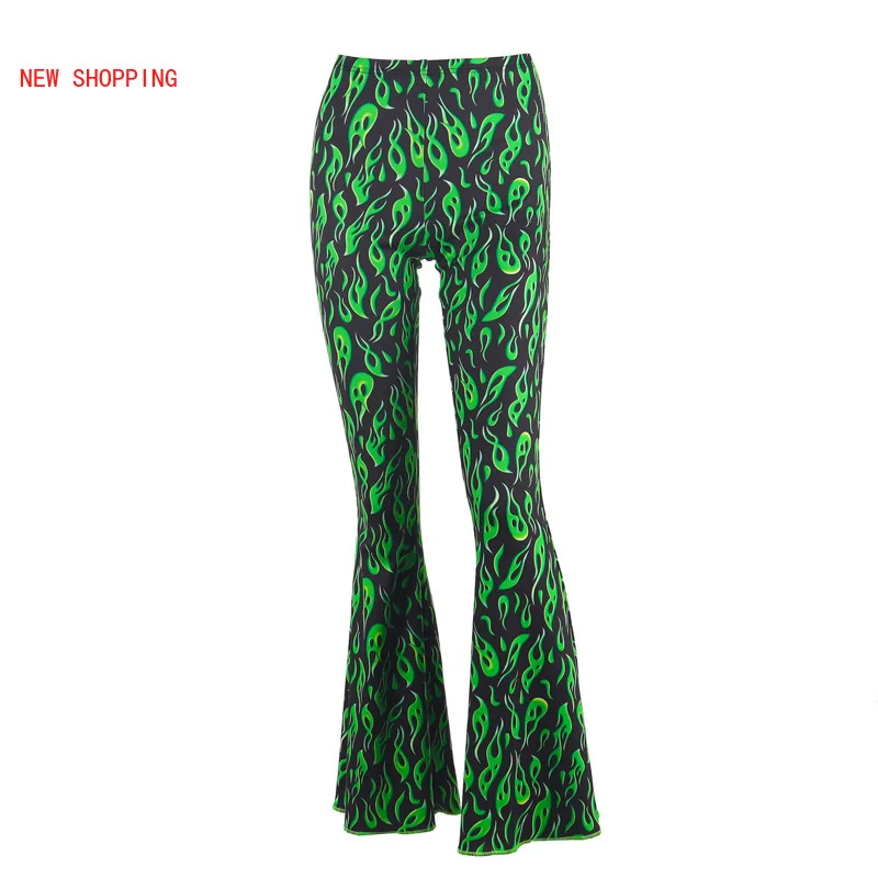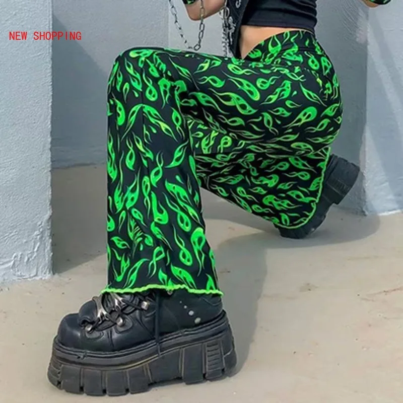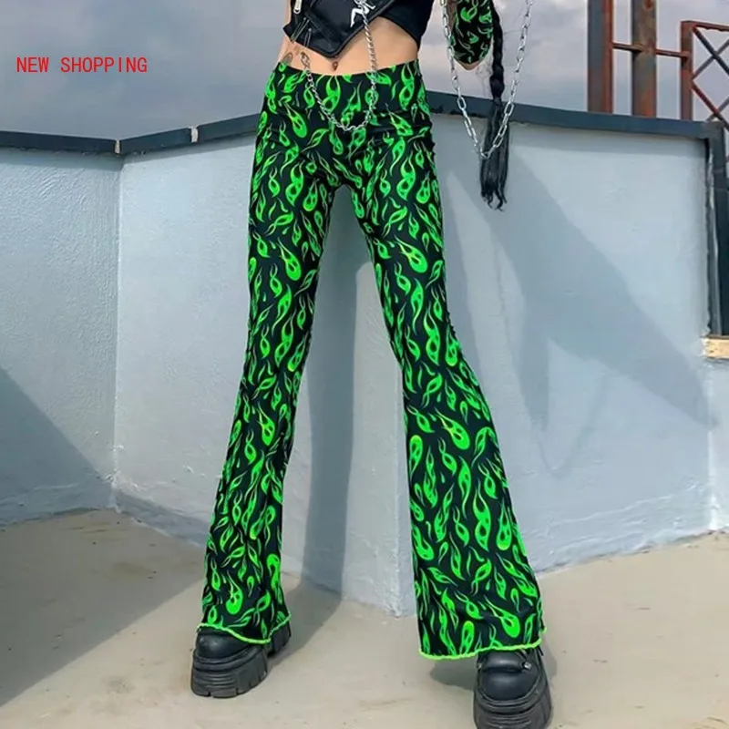 Зеленые расклешенные брюки в стиле Харадзюку с принтом огня, пикантные женские уличные брюки в стиле эмо с высокой талией, пикантные брюки в стиле пьяной эмо, Y2K, Осень-зима