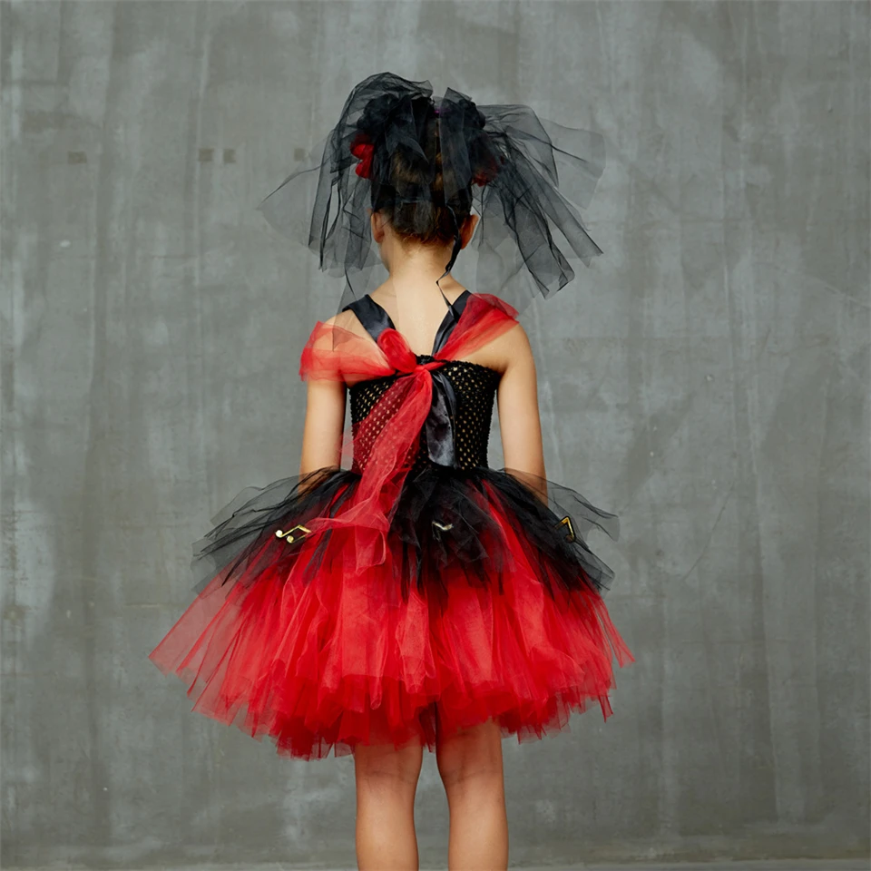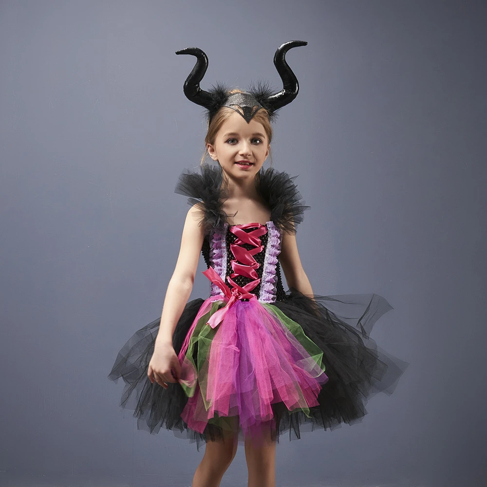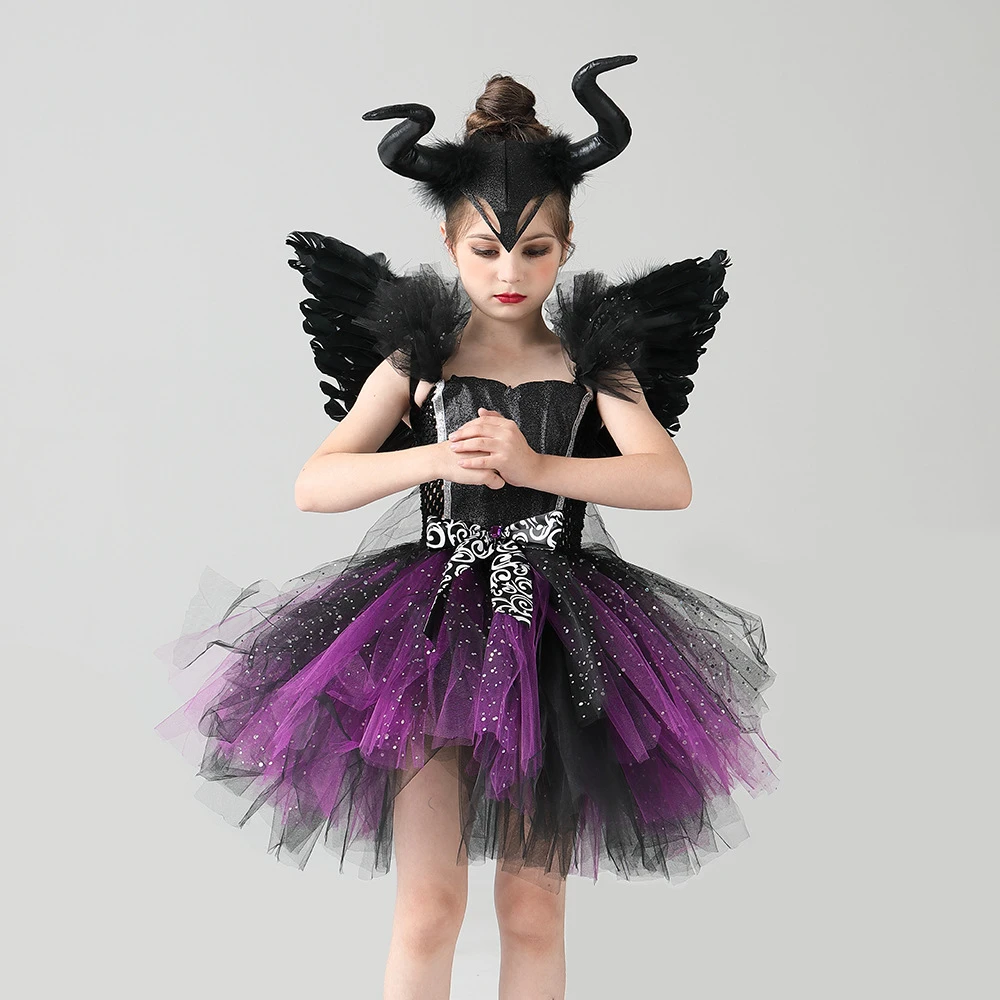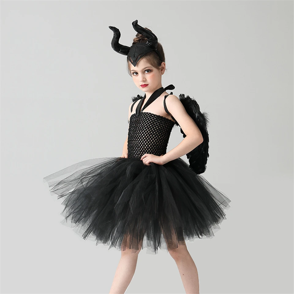 Костюм вампира для девочек на Хэллоуин, Карнавальная маскарадная вечеринка, платье чёрного демона, королевы, платье-пачка с перьями и крыльями