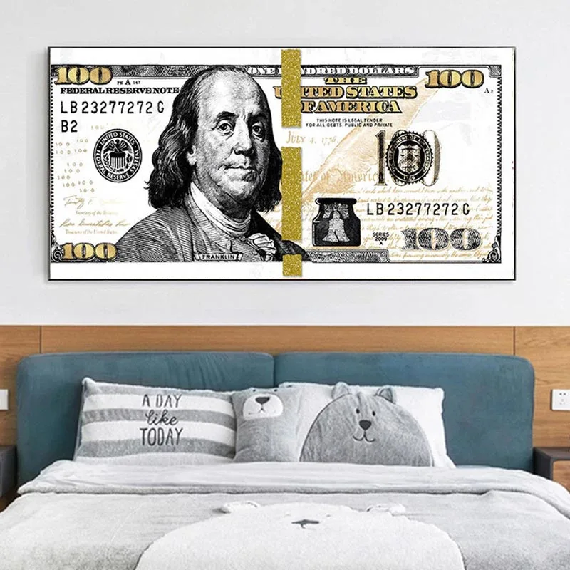 Плакат с изображением сто долларов и купюр, золотое, черное абстрактное искусство, монеты, настенное искусство, живопись на холсте, украшение для гостиной
