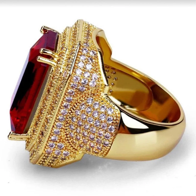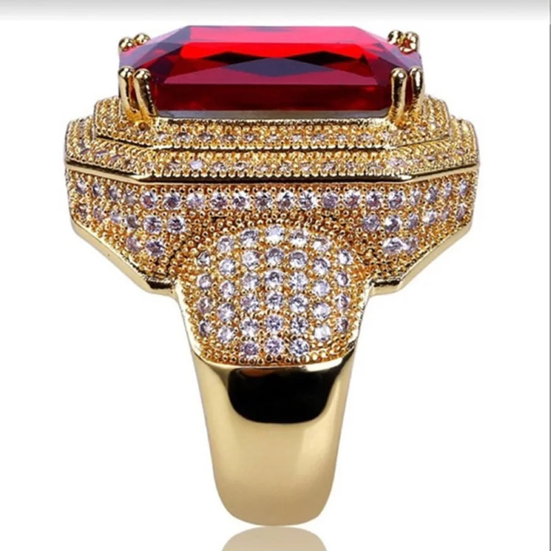 Модное большое мужское широкое красное циркониевое кольцо с геометрическим рисунком, роскошные обручальные кольца из желтого золота со сверкающими камнями для мужчин и женщин, ювелирные изделия в стиле хип-хоп