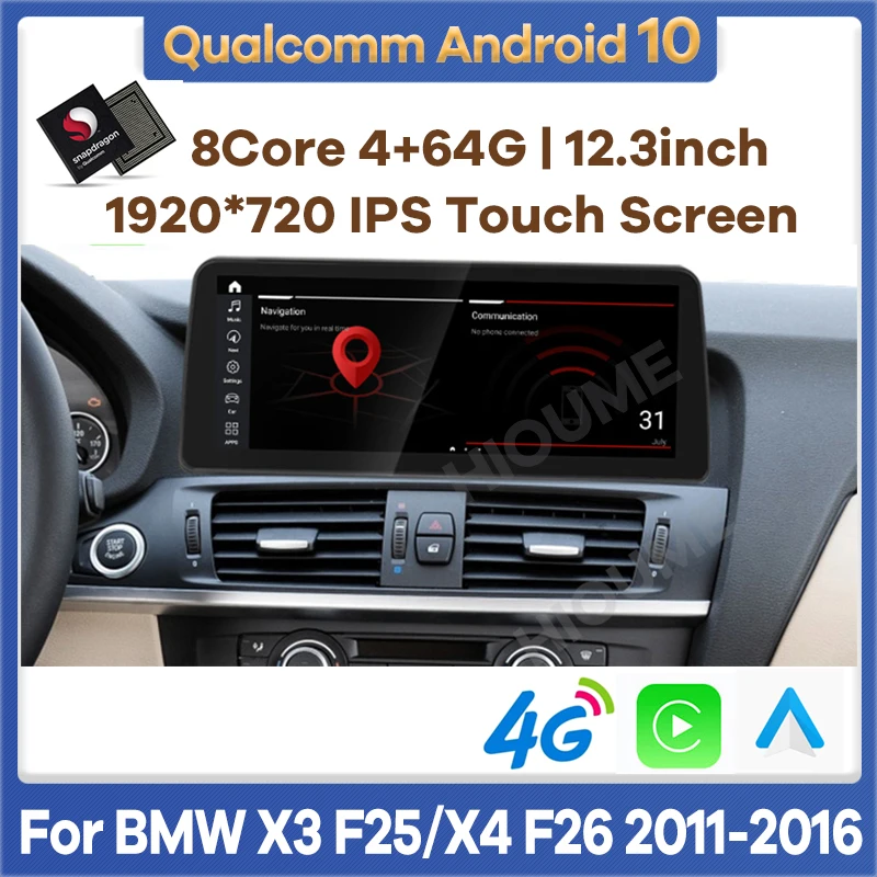 Автомобильный мультимедийный плеер Snapdragon, головное устройство на Android 10, с GPS Навигатором, для BMW X3, F25, X4, F26, CIC, для CarPlay, видео, стерео, 12,3 дюйма