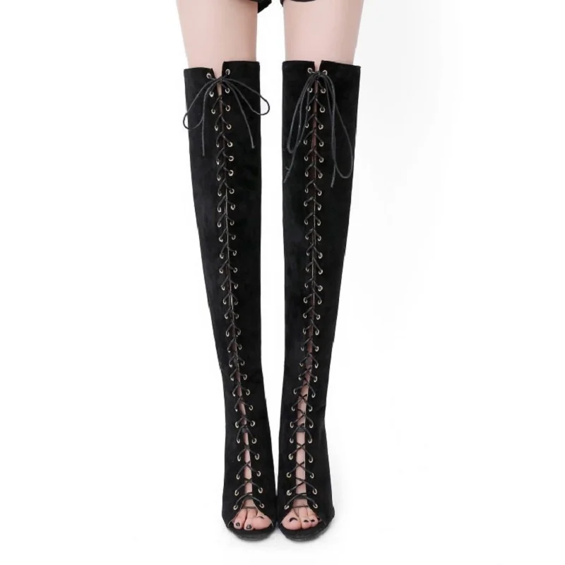Женские сапоги на молнии с перекрестной шнуровкой, черные сандалии-гладиаторы с открытым носком, женские праздничные Сапоги выше колена на высоком каблуке, 10,5 см