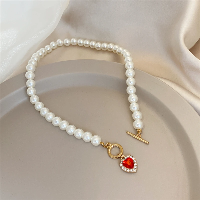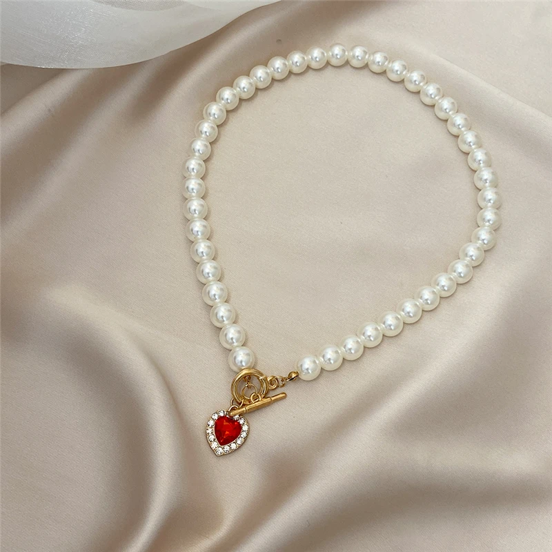 Винтажное жемчужное ожерелье для женщин ретро красный кристалл сердца кулон женские колье ожерелья подарки украшения