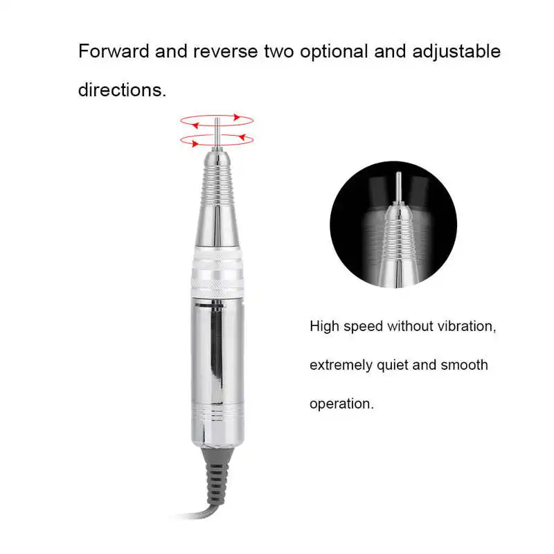 Особенности: 1. Изготовлен из высококачественного металлического материала, прочный, прочный и износостойкий. 2. Вперед и назад два дополнительных и регулируемых направления. 3. Дизайн ручки, удобный для захвата и простой в использовании. 4. Высокая скорость без вибрации, очень тихая и рабочая. 5. Легко менять сверла без инструментов. Работает на обоих естественныхИ искусственные ногти. 6. Идеально подходит для домашнего DIY и профессионального использования салона. Спецификация: Тип изделия: ручка для маникюра Материал: металл Цвет: как показано на фотографии Скорость: 35000RPMJack Спецификация: 5 контактов Товар Размеры: 14*2,5 см/5,5*1,0 дюймов Посылка: 1 * ручка для маникюра