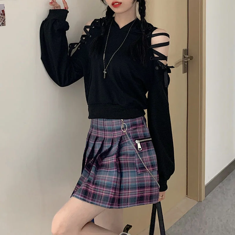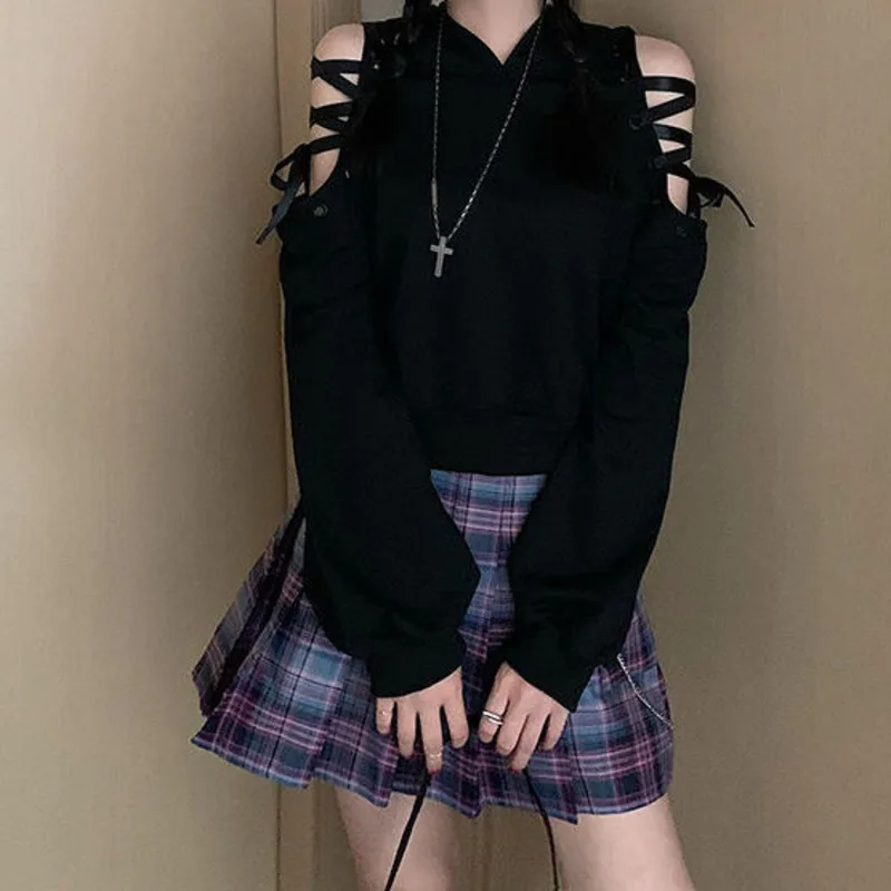 SXGOTH эмо одежда Cyber Y2k Толстовка Готическая Свитшот черная мешковатая Осенняя пуловеры оверсайз с открытыми плечами в стиле панк на Хэллоуин