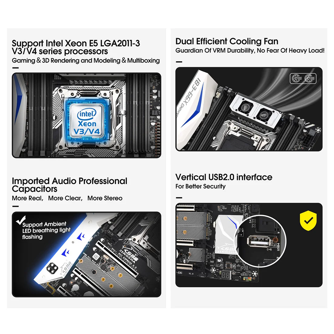 . Высокоскоростная Память DDR4, оснащенная процессором Intel Xeon E5 LGA 2011-3 V3/V4, значительно увеличивает производительность материнской платы с расходом 256 ГБ, чтобы удовлетворить потребности yuor, такие как интенсивные игры, поддержка HD-фильмов, телевидения, моделирования, рендеринга и многого другого.