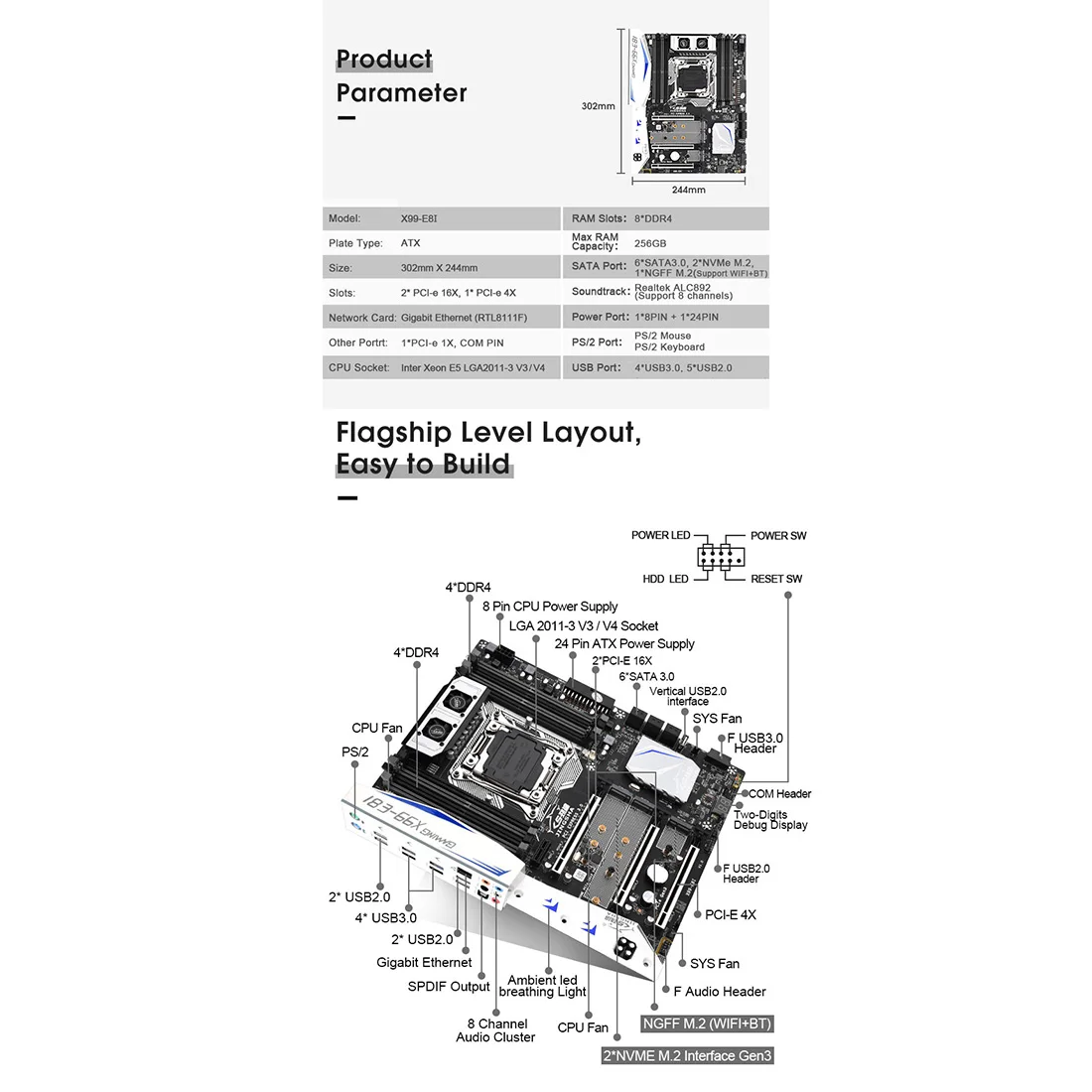 . Материнская плата ATX имеет длину 302 мм и ширину 244мм. Материнская плата премиум-класса с полными портами предназначена для различных разработок и приложений.
