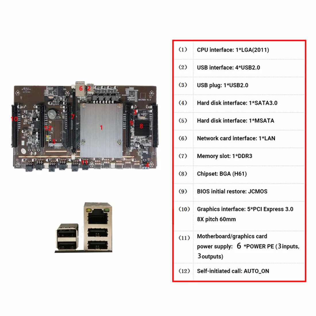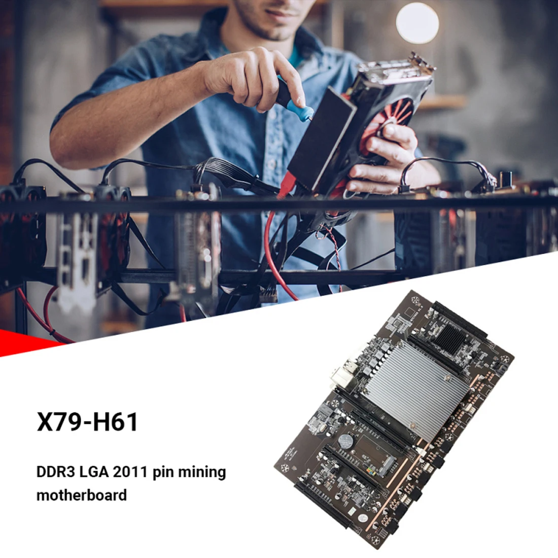 X79-H61 LGA 2011 майнинговая материнская плата CPU Socket 5 PCIe PCI-E Express 3,0 X8 Слоты DDR3 слот памяти для майнинга поддержка 3060 GPUОсобенности:. H61 чип и одноканальный LGA 2011 ЦП разъем, 5 PCIe X8 3,0 интерфейс видеокарты. Вычислительная мощность одного графического процессора составляет до 48MH / s, и он идеально поддерживает графические карты с видеопамятью 4 Гб, что значительно улучшает функцию майнинга вычислительной мощности. Поддерживает 3060 видеокарт, большое пространство 60 мм Слот для видеокарты. Подробная информация: CPU: 1 * LGA (2011); Usb-порт: 4 * USB 2,0; pin USB: 1 * USB 2,0; Интерфейс жесткого диска: 1 * SATA 3,0; Интерфейс жесткого диска: 1 х MSATA; Интерфейс сетевой карты: 1 * LAN; Слот памяти: 1 * DDR3; Набор микросхем: BGA (H61); Первоначальный сброс BIOS: JCMOS; Графический интерфейс: 5 * PCI Express 3,0 8X, шаг 60 мм; Материнская плата/Видеокарта Источник питания: 6 * power _ PE (3 входа, 3 выхода); Самостоятельный вызов: AUTO_ON. Примечание:-возможны небольшие погрешности в размере при ручном измерении. -Из-за различных эффектов освещения и настроек монитора фактический цвет товара может не точно отражать цвет на фотографиях.Характеристики:. Цвет: как показано. Материал: PCB + металл. Размеры изделия: 32,2x18,8x1 см. Вес изделия: 800 г. Размеры посылка: 36x26x6 см. Посылка Вес: 1000 г. Упаковка: коробкаПосылка:. 1 Материнская плата