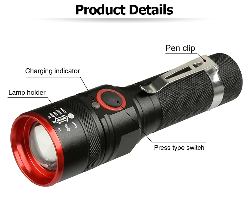 Тип лампы: T6Цвет: черныйСветильник: высокий/низкий/СтробоскопСрок службы: 100000 часовМасштабирование: Телескопический масштабируемыйВодонепроницаемость: IPX5, не подходит для дайвинга.Батарея: батарея 1x18650Материал: алюминиевый сплав