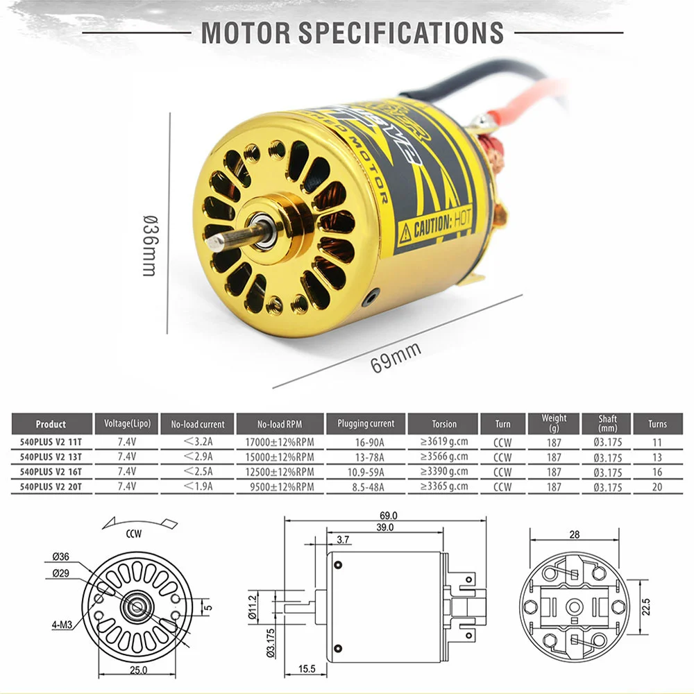 Спецификация:540 plus V2 11TНапряжение (lipo) : 7,4 ВТок без нагрузки:< 3.2AТок: 16-90AВес: 187Поворот: CCWВал: 3,175540 plus V2 13TНапряжение (lipo) : 7,4 ВТок без нагрузки:<2.9AТок: 13-78AВес: 187Поворот: CCWВал: 3,175540 plus V2 16TНапряжение (lipo) : 7,4 ВТок без нагрузки;<2.5AТок: 10,9-59AВес: 187Поворот: CCW вал: 3,175540 plus V2 20TНапряжение (lipo) : 7,4 ВТок без нагрузки:< 1.9A• Сила тока: 8,5-48AВес: 187Поворот: CCWВал: 3,175