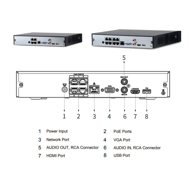 2. Аудио и видео:Вход ip-камеры:4/8 каналДвусторонняя Обратная связь: 1 канал Вход, 1 канал Выход, RCA