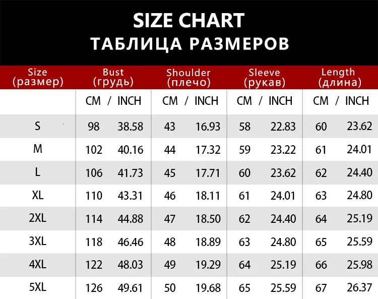 • Пожалуйста, строго следуйте таблице размеров, чтобы выбрать размер. Не выбирайте напрямую в соответствии с вашими привычками.• Изделие измеряется вручную, оно может отличаться на 2-4 см.• Эта куртка в азиатских размеров, Азиатские размеры меньше примерно на 2 размера, чем евро/американских размеров.• Все вышеуказанные измерения являются фактическими измерениями одежды. Для хорошей посадки, пожалуйста, при выборе размера из таблицы выше, добавьте 8 см ~ 10 см к груди вашего тела.• Пожалуйста, отметьте свой рост и вес, чтобы проверить свой размер при размещении заказа.