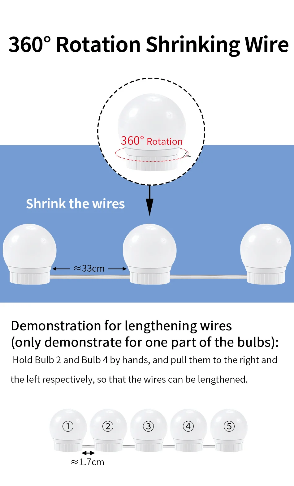 *Провод регулировки длины, минимальное расстояние между двумя лампочками может быть сократилась к составляет около 1,7 см, если вы думаете, что это слишком закрыт, он может быть удлинен, в соответствии с вашими запросами, очень прост в управлении.
