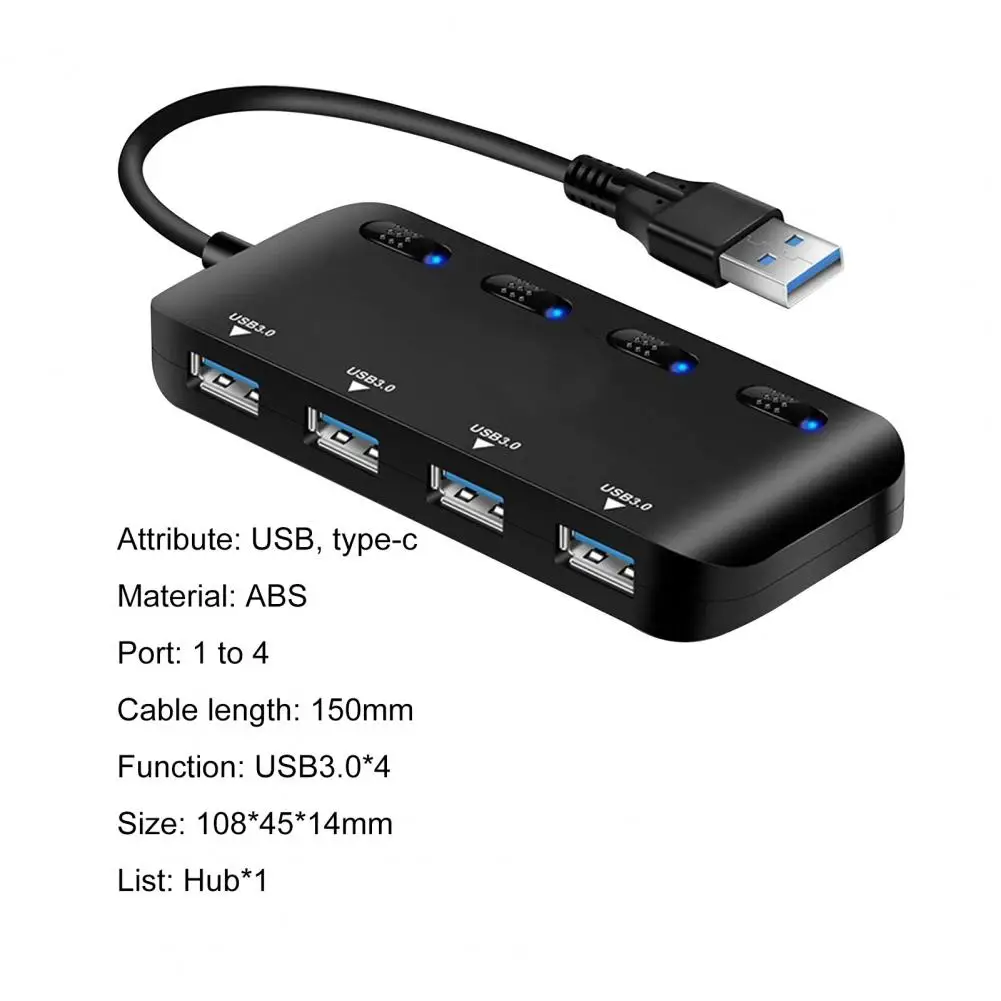 Docking Station 4 Ports USB3.0 ABS High Speed Cable Hub for Phone Description: The docking station allows for simultaneous use of four ports. It is plug and play, which is convenient to use. You are easy to carry and use this compact and portable docking station with lightweight design. It is convenient to control each USB port with individual on-off switches design. It is made of good quality ABS material, durable to use. The length of this product is 10.8cm, the width is 4.5cm and the height is 1.4cm. The docking station is suitable for being used in computer. Item Name: Cable Hub Material: ABS Color: Black Type: USB, Type-C Port: 1 to 4 Switch: Each Port Corresponds to A Switch, and with Indicator Light Cable Length: 150mm Interface: 4 x USB3.0 Features: Plug Play, 4 Ports, High Speed Size Details: 10.8cm x 4.5cm x 1.4cm/4.25" x 1.77" x 0.55" (Approx.) Notes: Due to the light and screen setting difference, the item's color may be slightly different from the pictures. Please allow slight dimension difference due to different manual measurement. Package Includes: 1 x Cable Hub (Others Not Included)