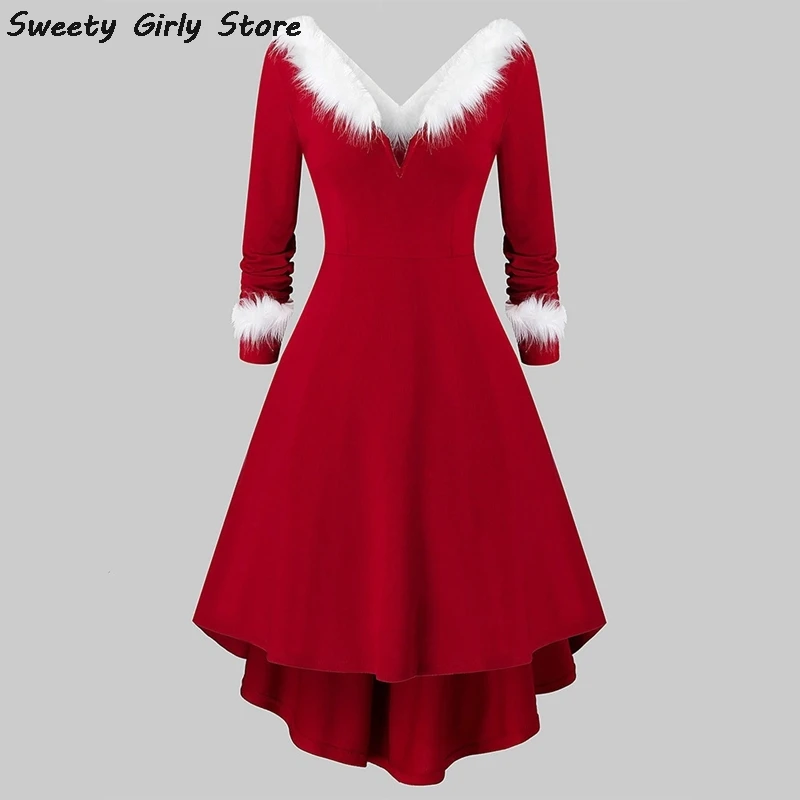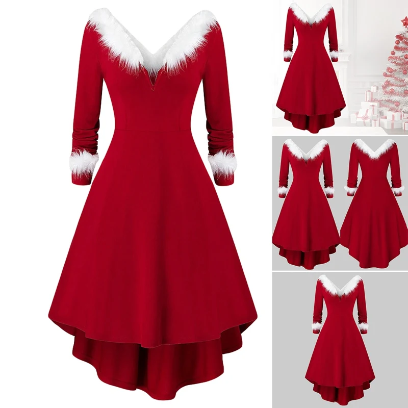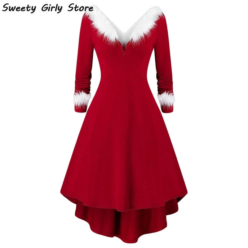 Женский Рождественский костюм, зимнее мягкое плюшевое платье красного цвета, необычное платье с длинным рукавом, Женская Клубная одежда для косплея с V-образным вырезом