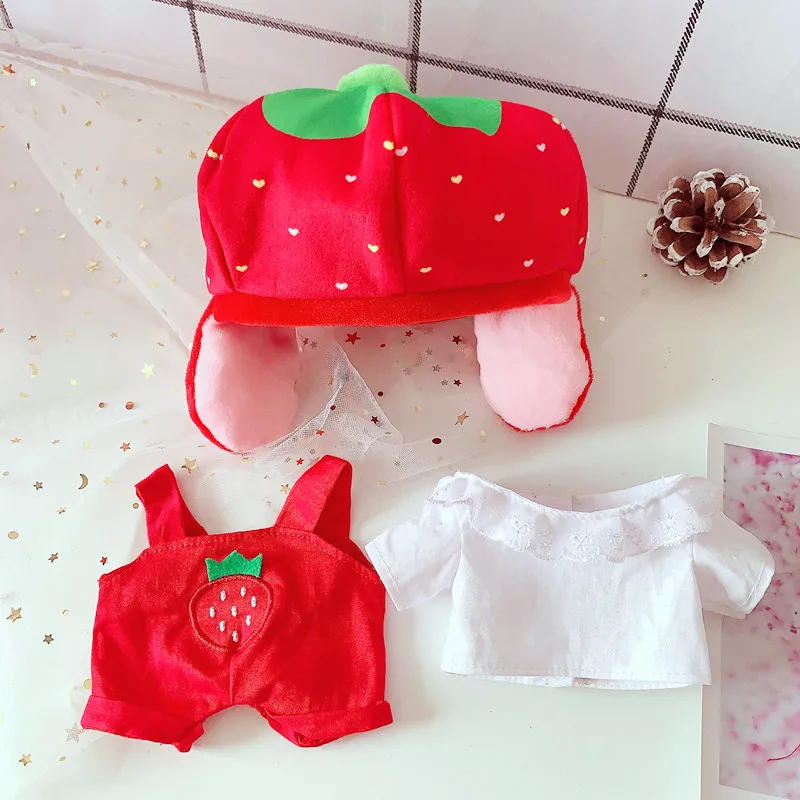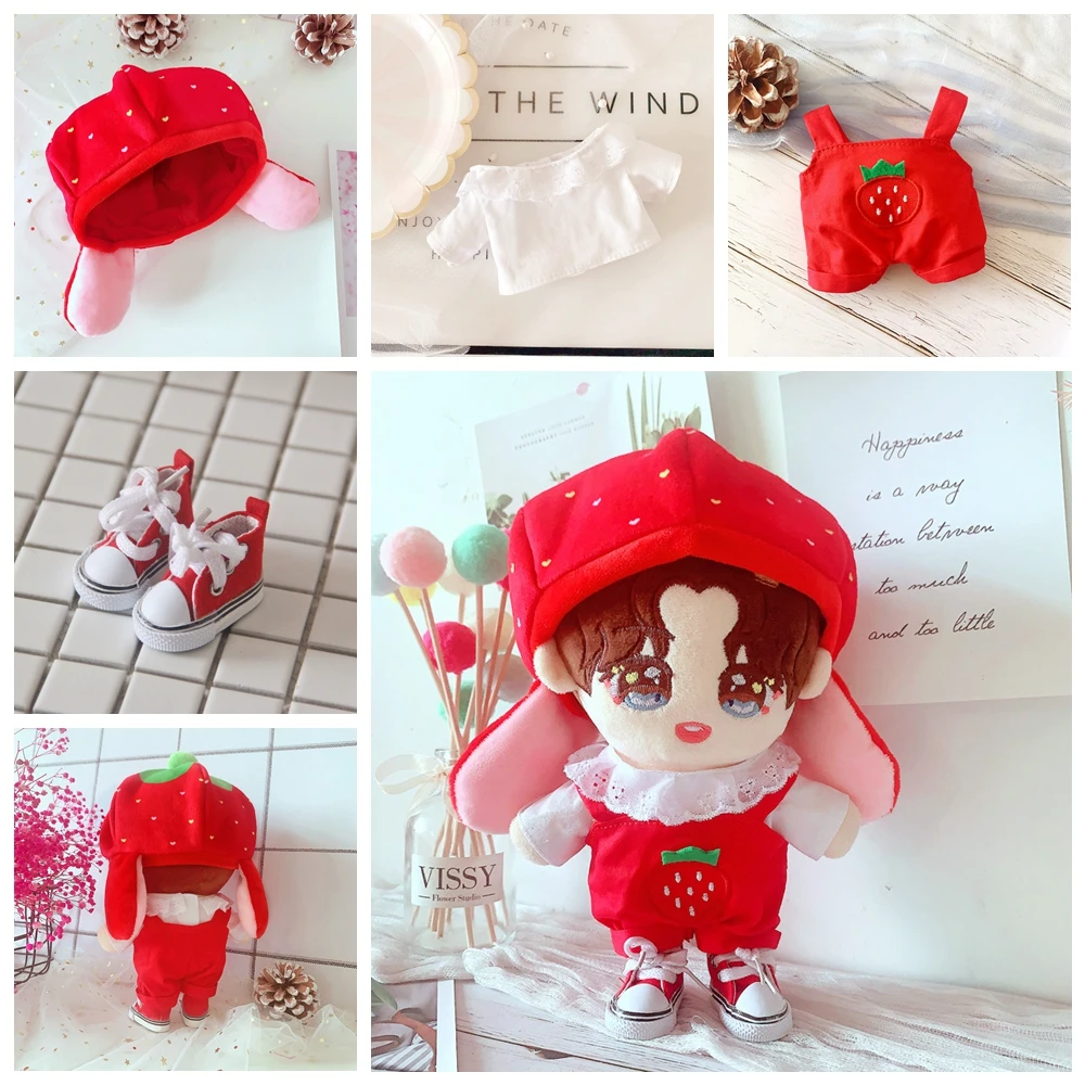 Наряд для кукол, 20 см, плюшевая Одежда для кукол, красный, комбинезон с клубничкой, мягкая игрушка, аксессуары для кукол Kpop, Корея, EXO Idol