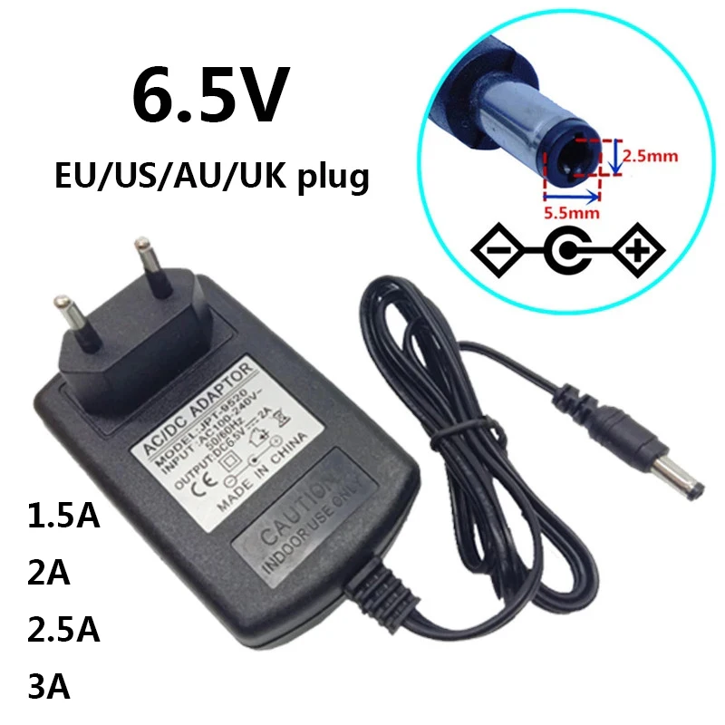 100% Бренд новый Высокое качество 100V-240V преобразователь переменного тока в постоянный, Мощность адаптер питания* Вход: AC 100-240V 50/60Hz* Выходное напряжение: 6,5 В постоянного тока 1.5A/2A/2.5A/3A* Выходная Полярность: внутри положительный (+). Внешний отрицательный (-)* Штекером постоянного тока для подключения к Размеры: 5,5 мм * 2,5 мм, также подходит для 5,5*2,1 ммЕсли есть особые требования, могут быть настроены 4,0 мм * 1,7 мм/3,5 мм * 1,35 мм/2,5 мм * 0,7 мм Размер вилки* Тип вилки: США, ЕС, Австралия или Великобритания на выбор.* Длина кабеля: (приблизительно) 80 см/31"