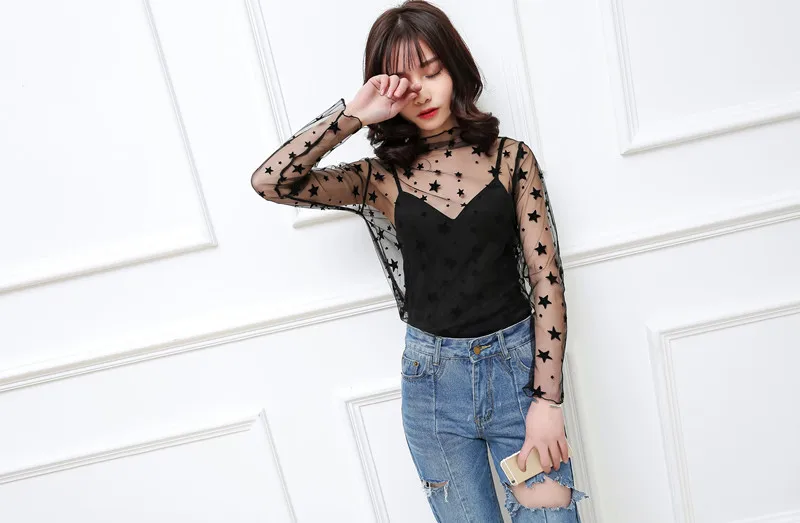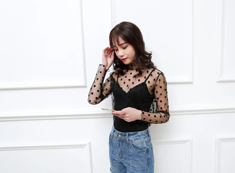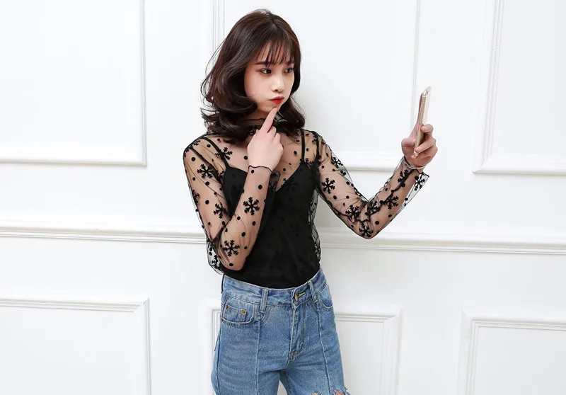Женские топы 2021, прозрачная нижняя рубашка, Женская Корейская версия, внутренняя черная Маленькая Сексуальная сетчатая кофта, пуловер с длинными рукавами