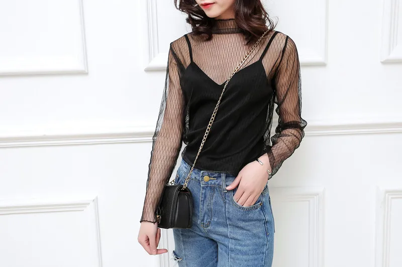 Топы для женщин 2021 прозрачная нижняя рубашка Женская Корейская версия внутренний черный маленький сексуальный сетчатый топ пуловер с длинными рукавами
