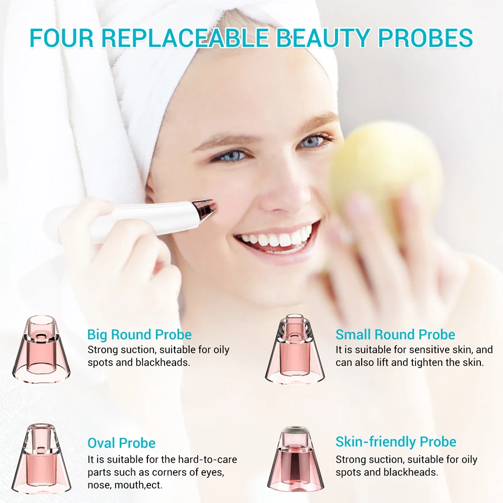 4. Упаковано с 4 различными зондами для решения всех ваших потребностей, удаления черных точек, жира, косметических остатков, прыщей, морщин из разных частей вашего лица, также эффективно для икродермабразии, улучшения жизнедеятельности кожи, помогает разогнать поры и делает вашу кожу гладкой и подтянутой.