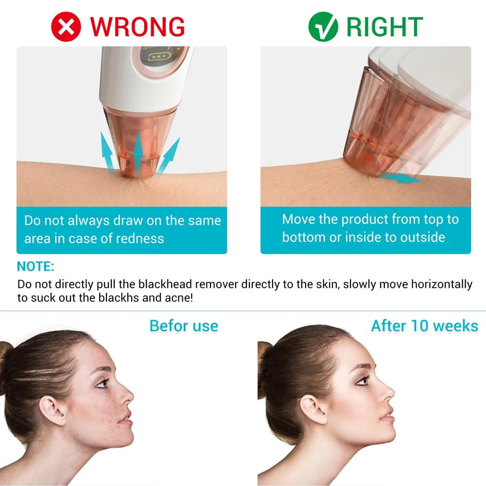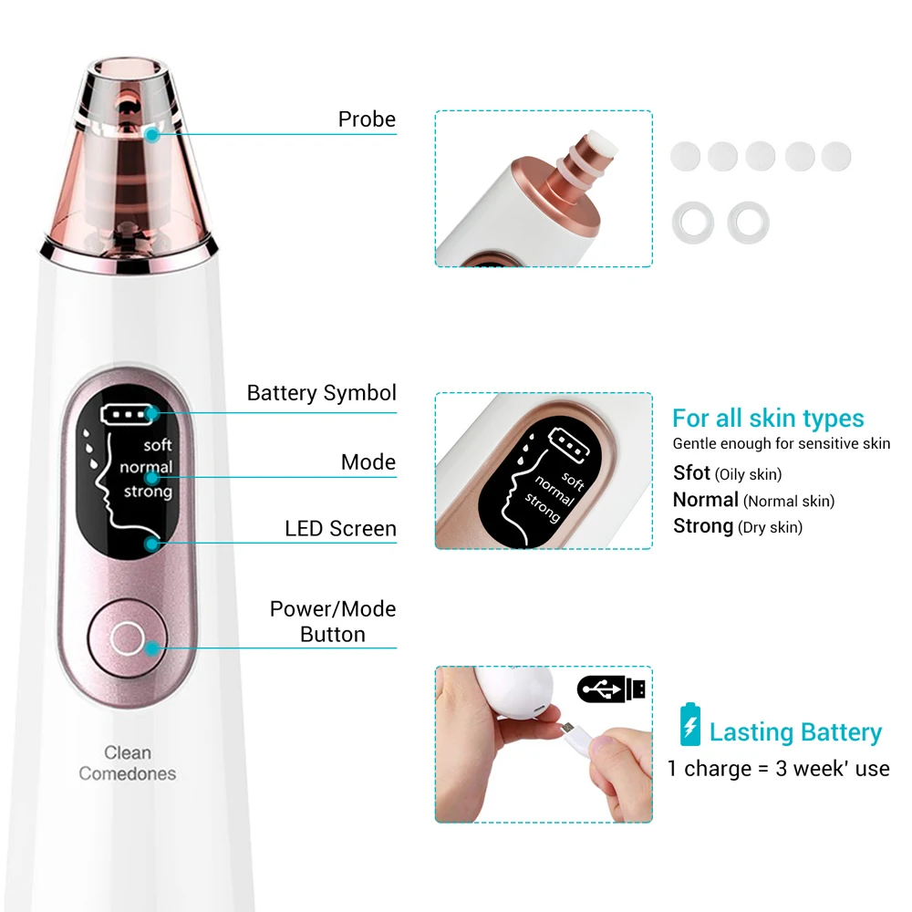 1.[Безопасный и эффективный] принять инновационную усовершенствованную технологию вакуумного поглощения для супер сильного всасывания, чтобы легко высасывать черные, белые головы, омертвевшую кожу, остатки макияжа, акне и прыщи с глубоким очищение пор, не раздражает и безболезненно.