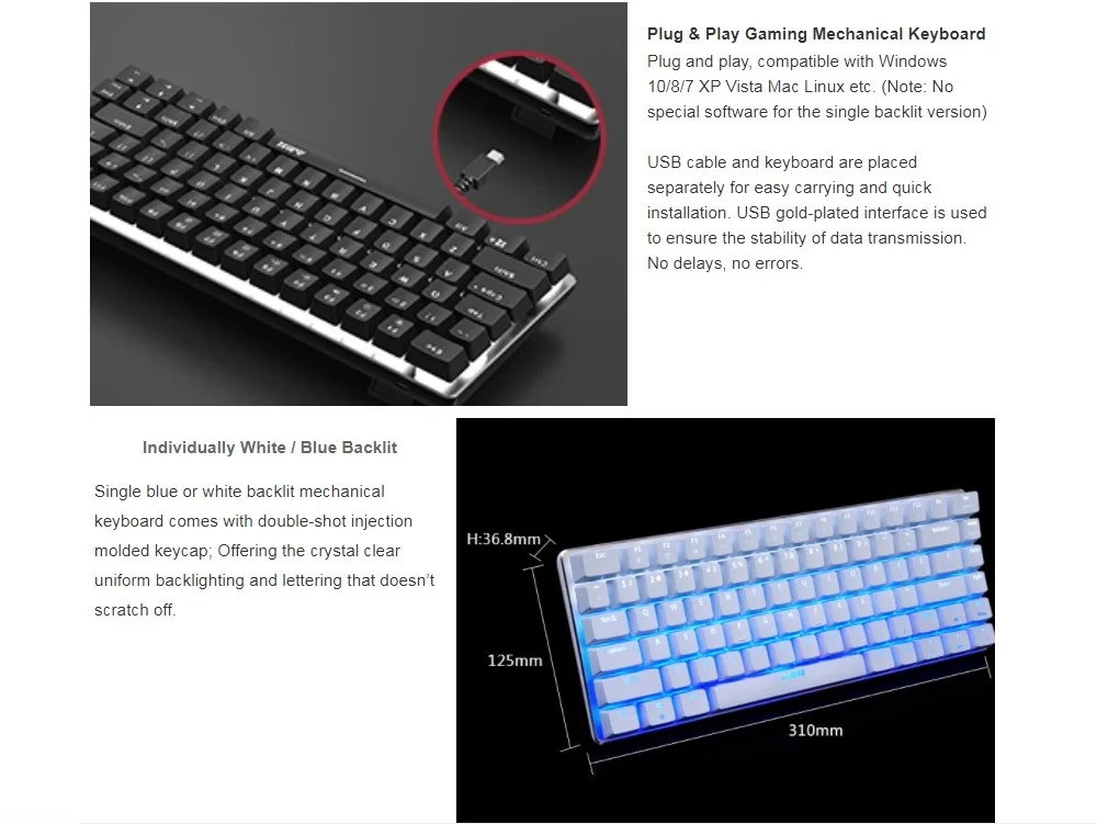 Тип клавиатуры: Механическая игровая клавиатураДлина провода клавиатуры: 1,6 мПодсветка клавиатуры: белое освещениеСоединение клавиатуры: подключи и работай через USBОсь клавиатуры: зеленый/красный переключатель опциональноКоличество колпачков: 82 ключаСрок службы ключа: 5 миллионов разМатериал панели клавиатуры: алюминиевый сплавВес клавиатуры: 800 гРазмер клавиатуры: 31,1 см * 12,0 см * 3,7 смПоддержка клавиатуры: WinXP/Vista/7/8/10/Android/Linux/Apple System s