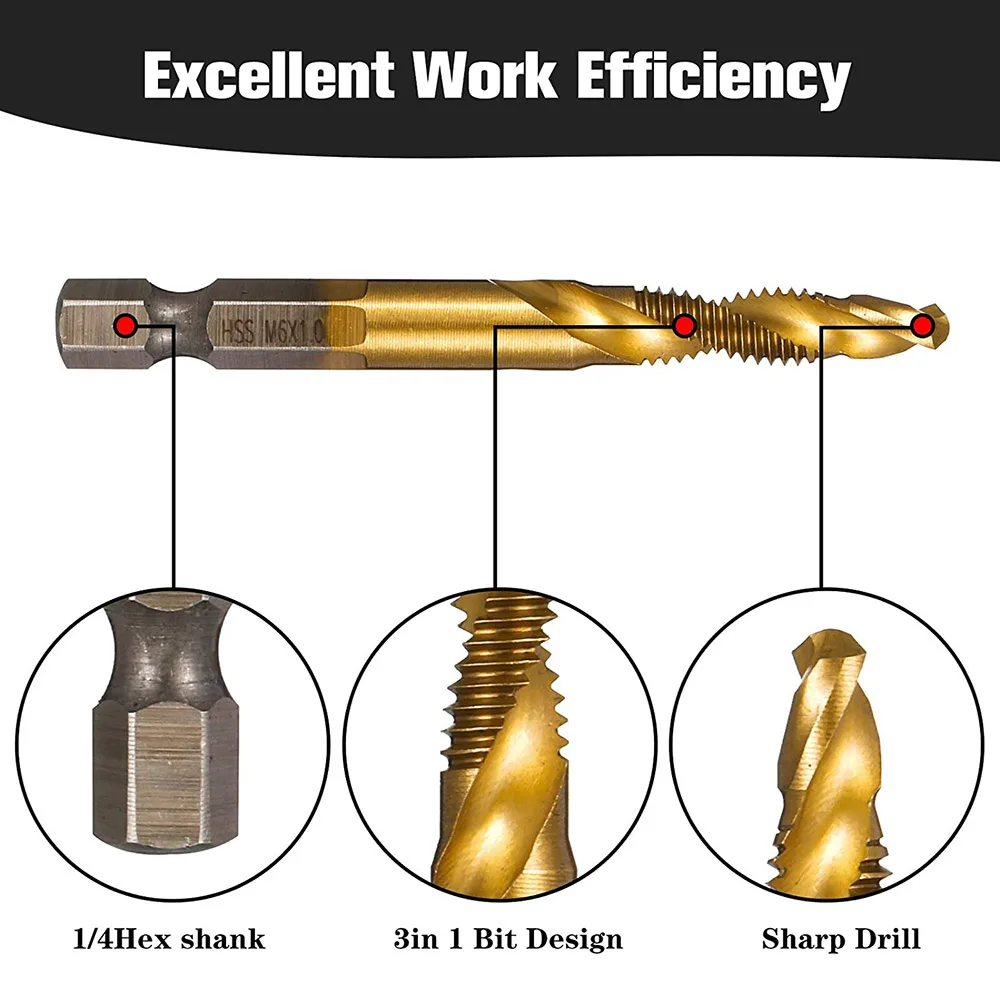 Материал: Высокоскоростная сталь (с титановым покрытием)Цвет: как показано на фотографииШестигранный хвостовик: 6,35 мм (1/4 ")Стандарт: метрическийРазмер резьбы: M3, M4, M5, M6, M8, M10Шаг: 0,5 мм, 0,7 мм, 0,8 мм, 1,0 мм, 1,25 мм, 1,5 ммИспользуется: машинаФункция: сверлениеКоличество: 6