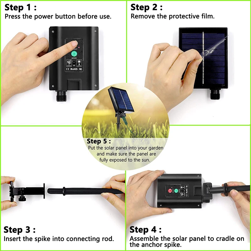 ①Пожалуйста, включите сначала перед зарядкой, он будет заряжаться в дневное время и светильник на рассвете автоматически.②Убедитесь, что панель солнечных батарей находится в солнечном месте-не в затененной зоне-и панель солнечных батарей поднимается вверх.③Перед первым использованием рекомендуется полностью зарядить солнечную панель в течение 8 часов.