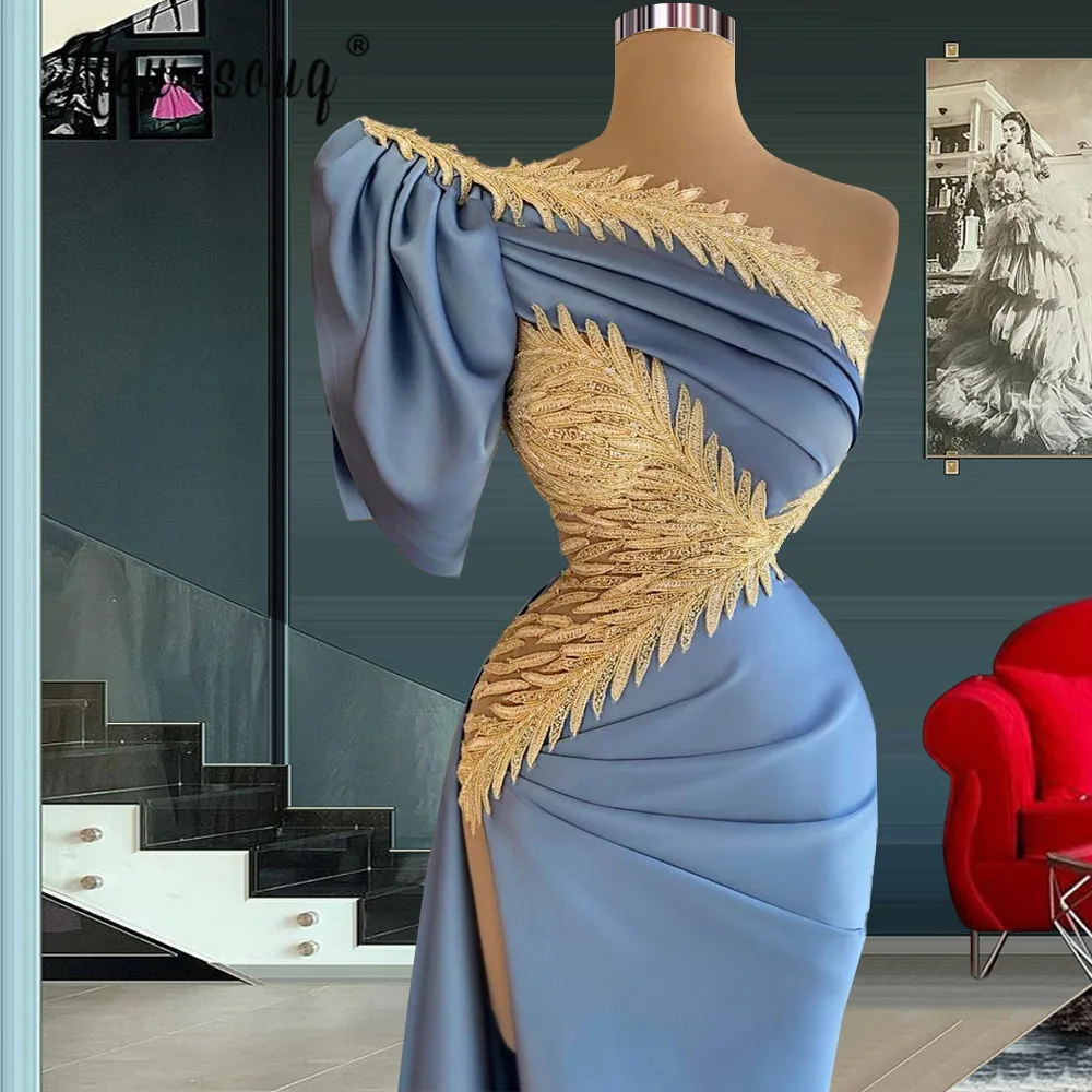 Женское вечернее платье на одно плечо, светло-голубое длинное платье с рукавами-фонариками, разрезом сбоку, 2021