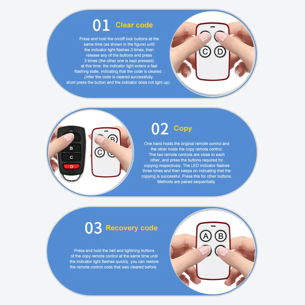 AK-K210605 Универсальный копировальный пульт дистанционного управления 4 кнопки Электрический гаражный ворот открывалка двери клон, Дубликатор клонирования обучения код автомобиля ключХарактеристика:Светодиодный светильник-индикатор: привлекательный светодиодный светильник, рабочий статус-четкий.Жесткие резиновые Ключи: Жесткая Резиновая матовая поверхность, на ощупь чистая и чистая, и отзывы четкие.Красочная Оправа: тонкий корпус оснащен красочной оправой, которая имеет модный вид.Круглые и тонкие: круглые, как камушки.Спецификация:Название продукта: четырехкнопочный пульт дистанционного управления для беспроводной копииМодель изделия: AK-K210605Цвет изделия: белый, черный, белый, красный (по желанию)Рабочая частота: 315 МГц/433,92 МГц (опционально)Схема питания: DC6V (кнопочный аккумулятор CR2016 * 2) Источник питанияТок в режиме ожидания: менее 0,1ua;Диапазон температур: -20 - 70 ℃, он может нормально работать даже при суровой температуре окружающей средыНоминальное напряжение: DC6VТок излучения: 11 мАТок покоя: <0.1uAРасстояние запуска: >30 м (измеряется в открытой местности)Частота передачи: 315 МГц/433,92 МГцРазмер изделия: 62.3x37.2x10.7 мм/2.45x1.46x0.42in (включая корпус)Вес изделия: 21,20 г (включая корпус)Обзор:AK-K210605 пульт дистанционного управления с четырьмя клавишами белого корпуса использует чип 12F683 основного управления, поддерживает онлайн-программирование и может быть запрограммирован повторно.Встроенный EEPROM, может копировать другие обычные пульты дистанционного управления с той же частотой, может Очистить коды и узнать коды в любое время, легко и быстро использовать, и может использоваться в автомобильном пульте дистанционного управления, управление освещением, умное домашнее дистанционное управление и другие области.Описание функции:(1) операция копирования кода:Если пульт дистанционного управления проверил код, код должен быть очищен до проверки кода.Операция по совпадению кода: Нажмите одну кнопку скопированного пульта дистанционного управления и скопируйте пульт дистанционного управления одновременно, до тех пор, пока светильник с пультом дистанционного управления не начнет мигать от быстрого до стабильного, чтобы указать, что код успешно совпадает, вы можете отпустить две кнопки дистанционного управления.Остальные ключи также работают последовательно в соответствии с этим методом до тех пор, пока все ключи не будут скопированы.(2) Очистка кода:Пресс и удерживайте две кнопки на верхней части копия дистанционный пульт (две кнопки рядом с индикатором светильник) в одно и то же время до тех пор, пока индикатор светильник быстро мигает, затем нажмите одну из двух кнопок сверху три раза, чтобы очистить код (Во время этого процесса удерживается другая кнопка).(3) операция кода восстановления:Пресс и удерживайте две кнопки под копию дистанционный пульт на одной и той же до тех пор, пока индикатор светильник быстро мигает, можно удалить дистанционный пульт код, который был очищен перед.Вопросы, требующие внимания:Рабочее напряжение не может превышать Номинальное напряжение.В среде с высокими беспроводными помехами расстояние передачи может быть уменьшено.Хранить в недоступном для детей месте.Запрещено использовать его во влажной среде, в противном случае это может привести к повреждению пульта ДУ.Примечание:В связи с различиями мониторо