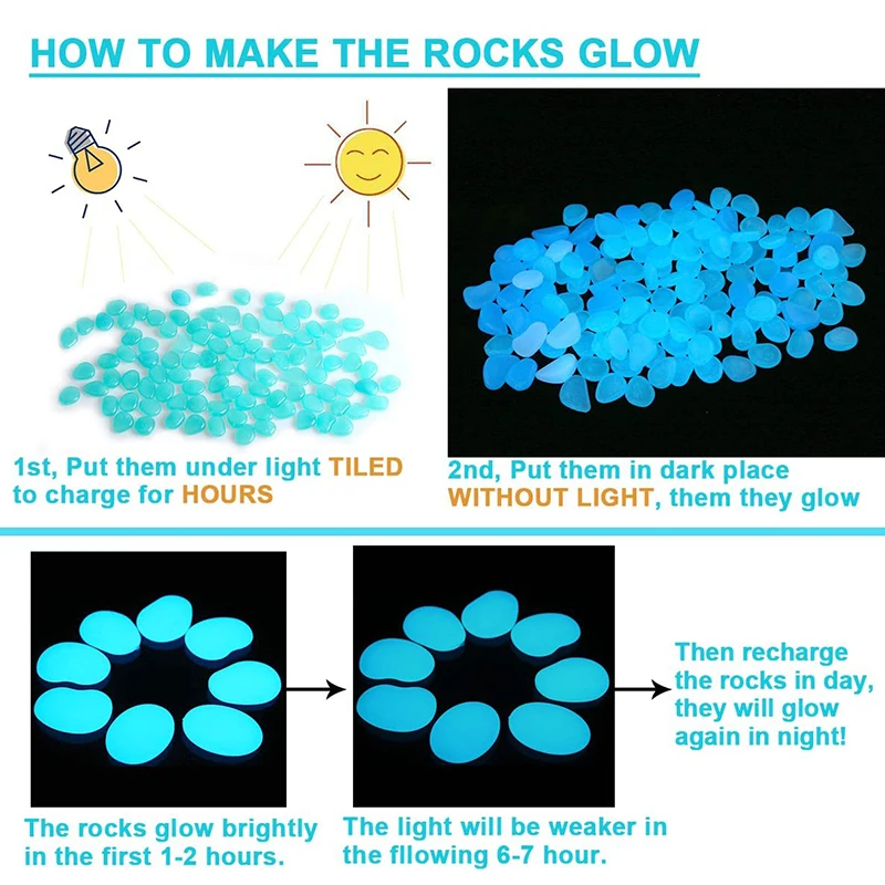 При использовании этих светящихся гальек не кладите их сверху друг на друга, а разложите так, чтобы они полностью подвергались воздействию светильник. Для того, чтобы лучше блеска в ночное время, мы рекомендуем установить; Светящаяся обувь галька рядом с светильник источник (такие как уличный светильник s).